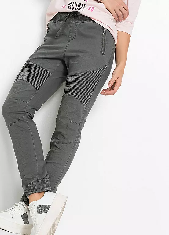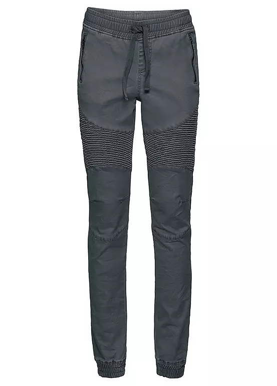 A cool pair of used look cotton joggers with biker stitching at the knee and an elasticated drawstring waist. Machine washable. 97% Cotton, 3% Elastane. Inside leg approx. 79.5 cm.