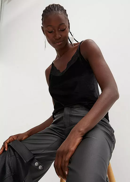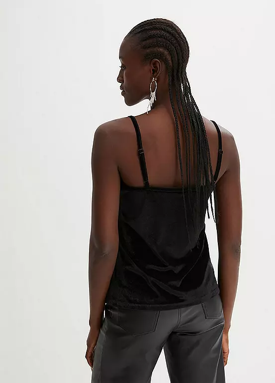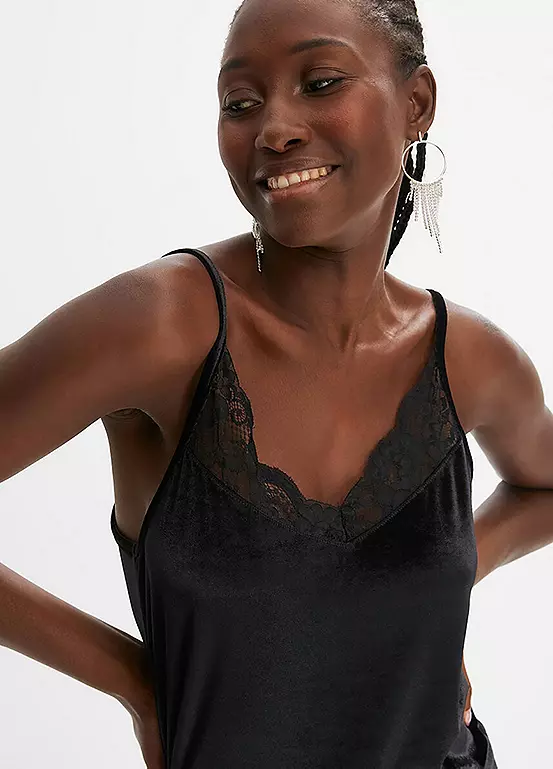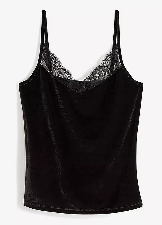 Luxe velvet top with lace trim along the neckline. Length approx. 60 cm.