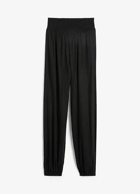 Floaty harem trousers with stretch smocking at the waist and hems. Machine washable. Inside leg approx. 78.5 cm.