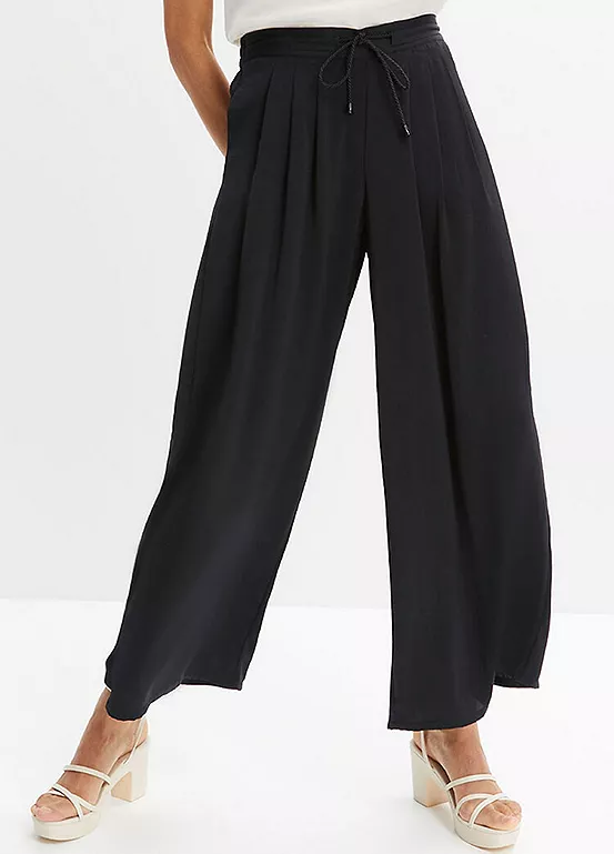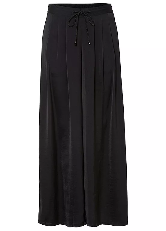 Wide leg trousers with cord ties at the elasticated waist.