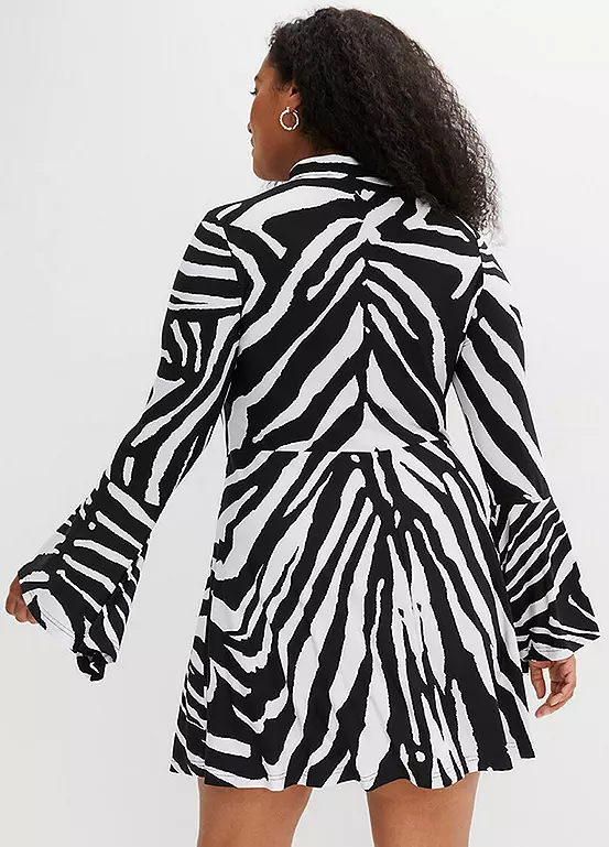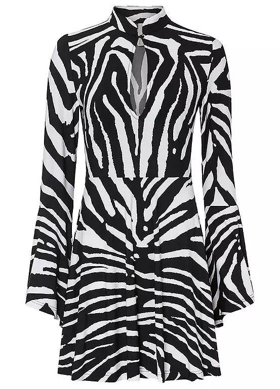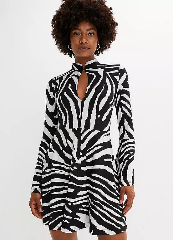 Turtleneck jersey dress with a cut-out and long bell sleeves. Length approx. 86 cm.